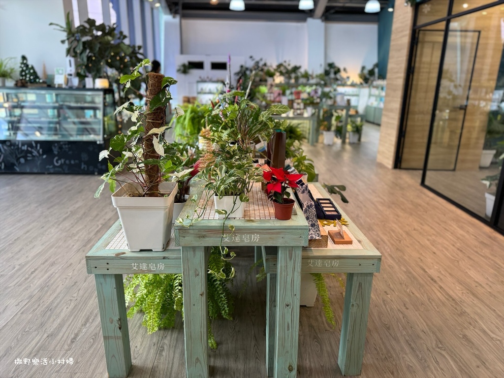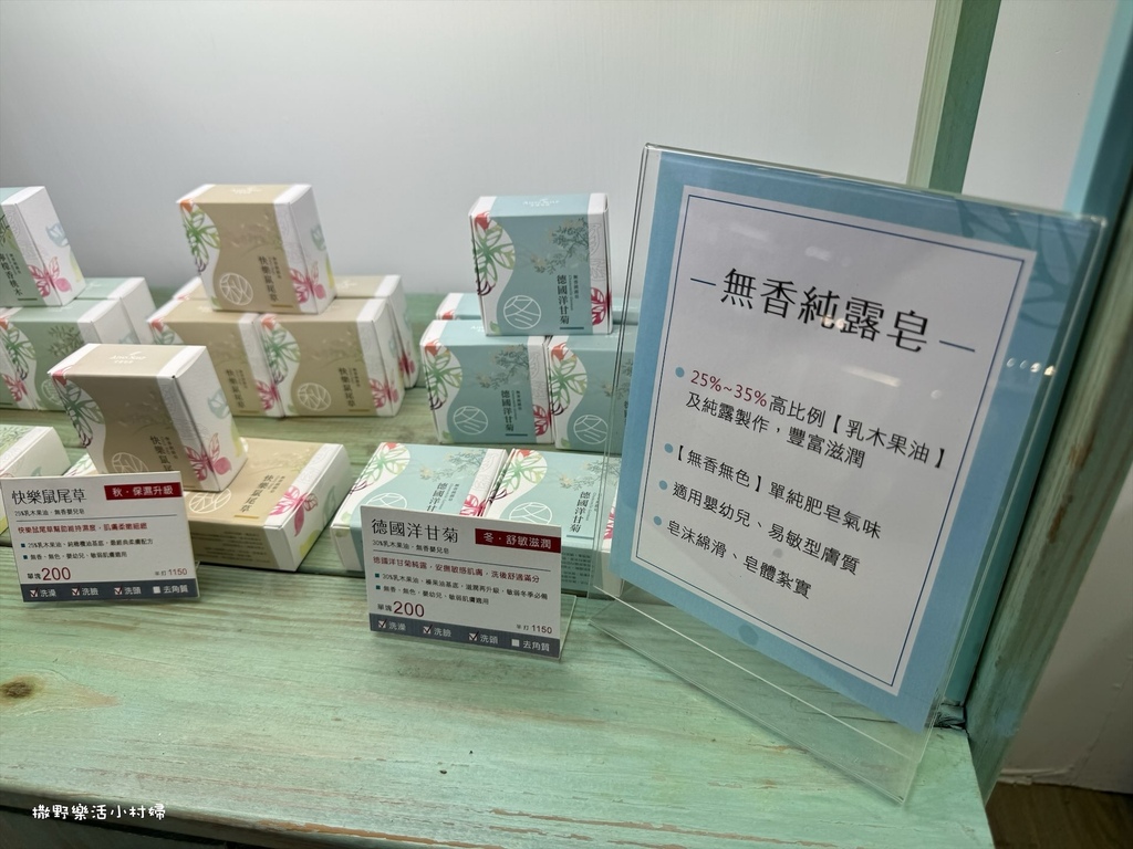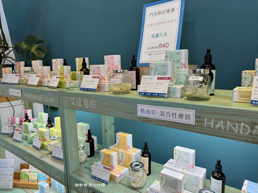 藍綠色的復古木架,擺滿了清新綠意的盆栽和各式各樣精美的手工皂,種類的名稱、功能和價格也都清楚的標示在商品前,讓民眾一覽無遺