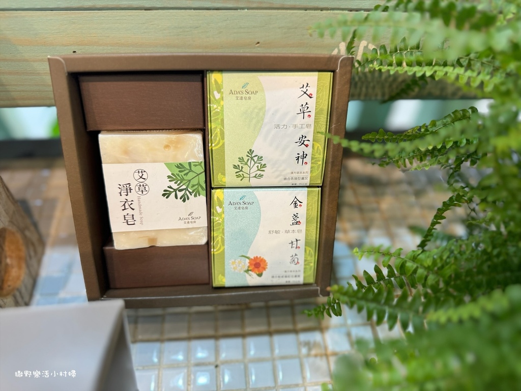 禮盒內容包含有全身淨化、舒敏溫和的艾草皂、金盞花皂,以及艾草淨衣皂,由內而外都有淨化實用的功能