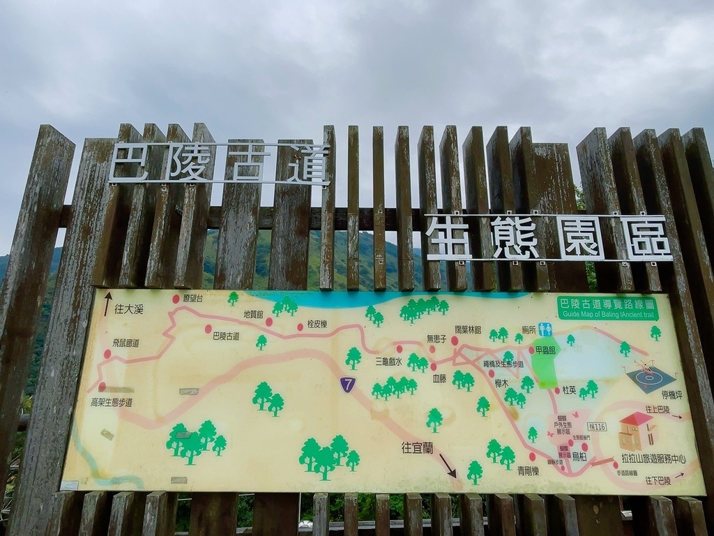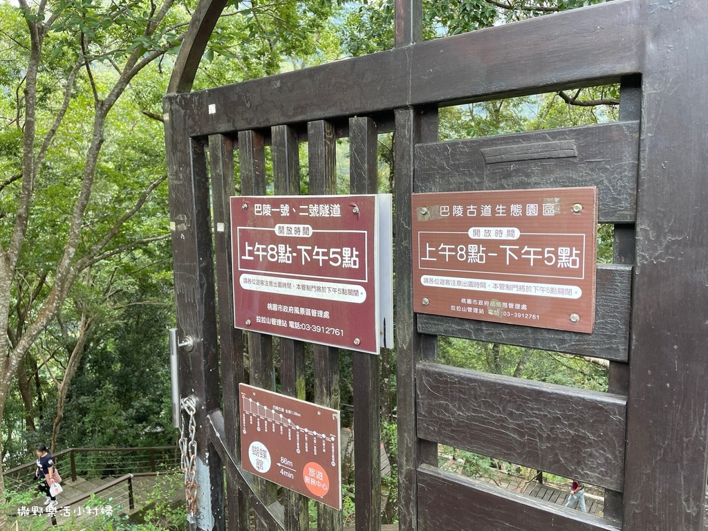 園區免門票,開放時間為上午8點到下午5點,進入時請務必留意回程時間,下方為巴陵古道的示意圖,說明從拉拉山遊客中心進入後的各個景點,每一個景點的距離都不會很長,但是會有高低坡度的落差,也就是說進入步道是沿途下坡,但回程方向就是緩坡爬升,所幸步道與石階鋪設得很好並不會太難走,森林步道後面可以連接到巴陵隧道、巴陵大橋,整體規劃還不錯
