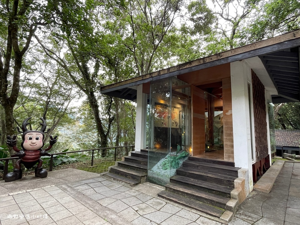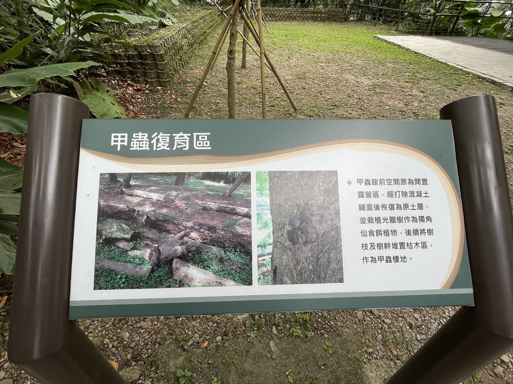 離開蝴蝶館不到3分鐘,我們沿著石磚階梯往下走就到了昆蟲館,館外空地是用來復育甲蟲的,旁邊栽種了獨角仙最喜愛的光臘樹做為棲息之處