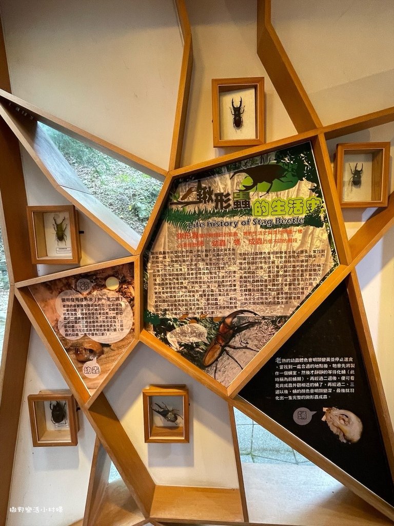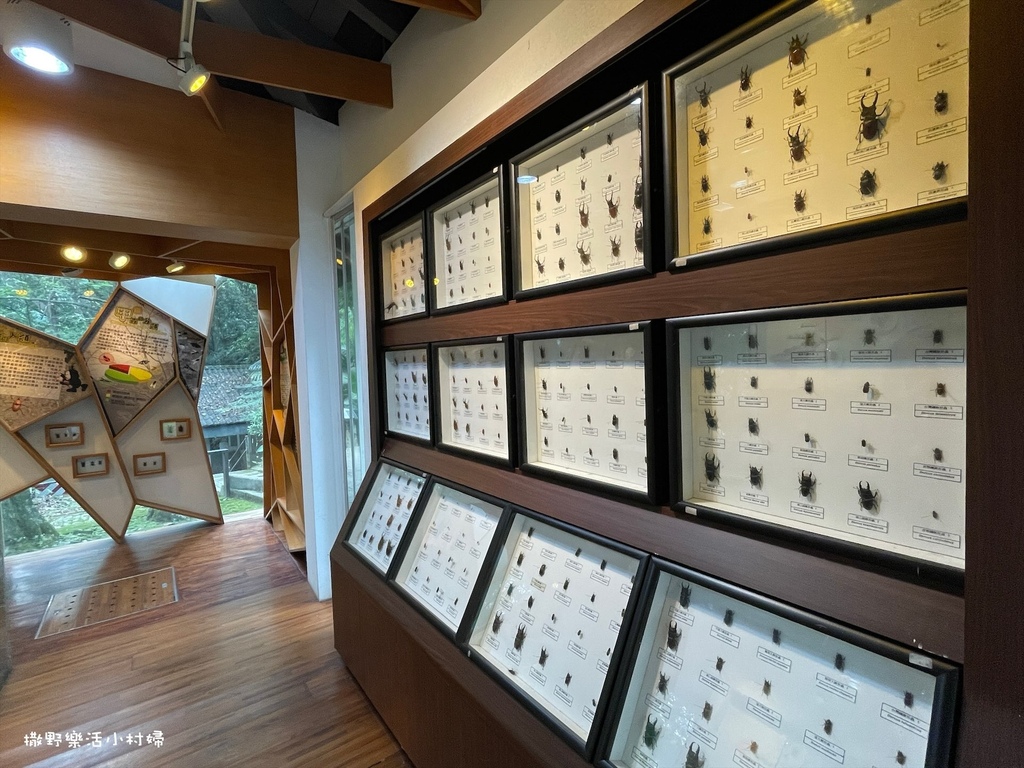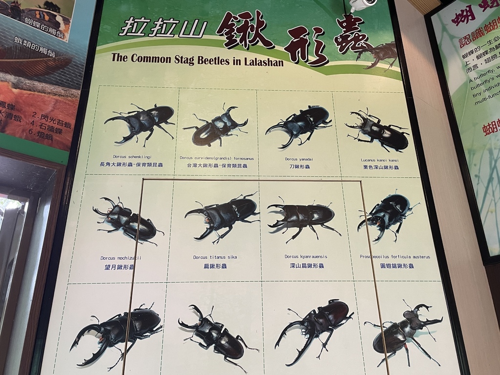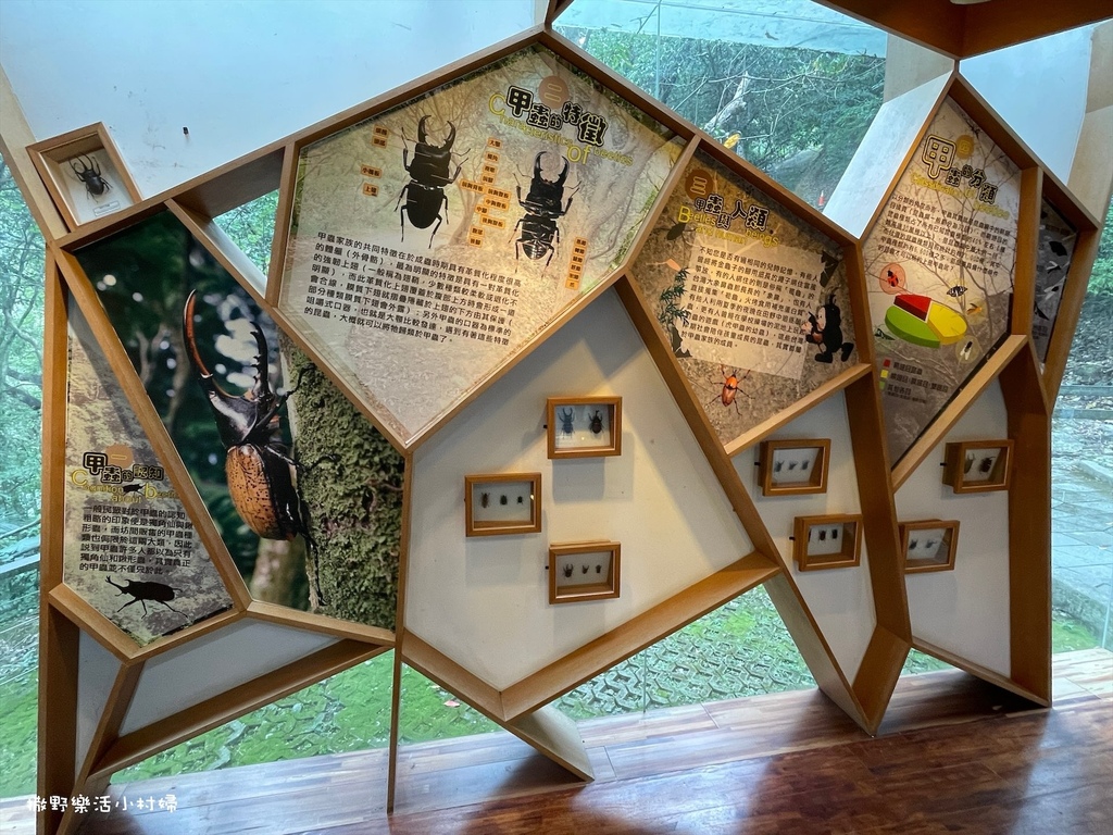甲蟲館室內不大,由一座閒置的涼亭改造而成,裡面展示了拉拉山地區甲蟲標本,種類之多也讓人大開眼界,平常在野外森林不容易發現的甲蟲,這裡用比較簡易的圖文說明了他們的生長環境、特徵和習性,讓一般民眾可以加以認識