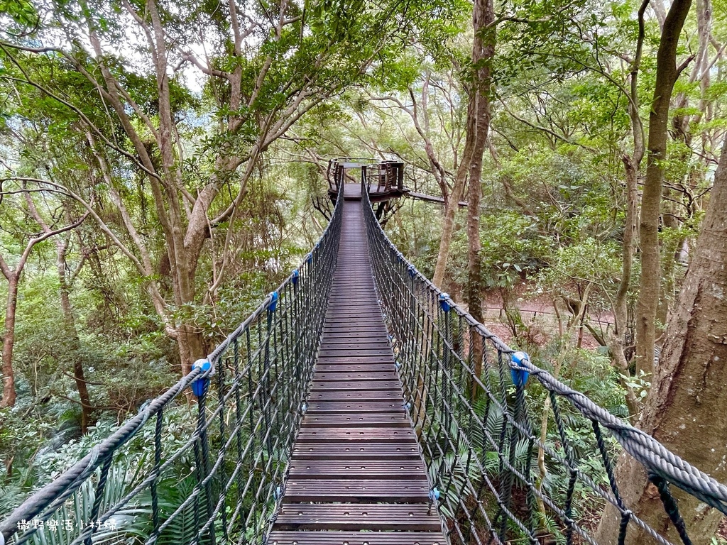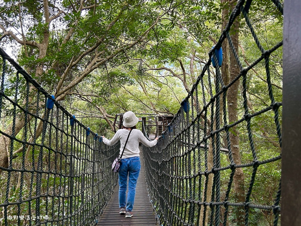這步道中最厲害的就屬這一座探索繩橋,其實它離地面足足有12公尺高,也僅能容單人通過,經過繩橋之時不會太搖晃,走起來感覺很安心,如果不想走繩橋,其實下方也是有替代的步道啦,不過我覺得這一段一定要體驗一下,畢竟懸在森林當中的吊橋很有趣也有冒險的刺激感