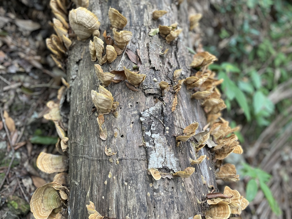 走著走著剛好看到長著菇菇的枯木,有一種奇特的自然美,為她拍一張寫真吧