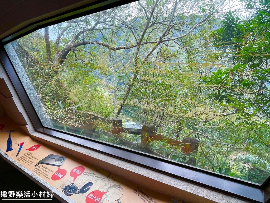 另一側的觀景窗最吸引人注意,這裡不但可以欣賞外面的山川河流景色,其實仔細看玻璃上還有手繪圖案,而窗戶前的小平台也有地質學家研究地形所用到的一些測量與觀察工具