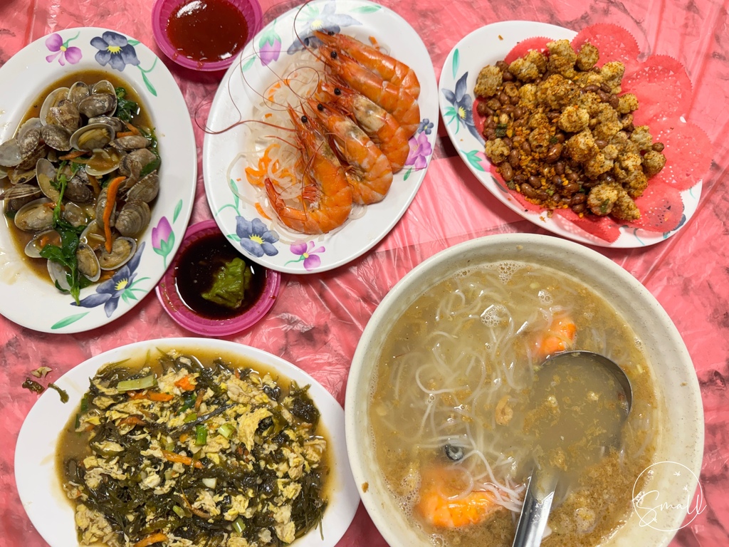 我們當天點了海瓜子、燙鮮蝦、海菜炒蛋、小卷米粉湯、鹽酥龍珠