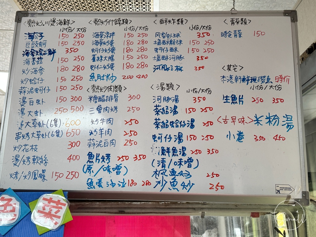 鄉味津海鮮的菜單都寫在大黑板上,有川燙/熱炒海鮮、一般熱炒、酥炸類、生魚片、青菜類、湯品、古早味米粉湯,餐點有分大小份,直接看黑板點菜,有選擇障礙的也可以請服務人員介紹唷