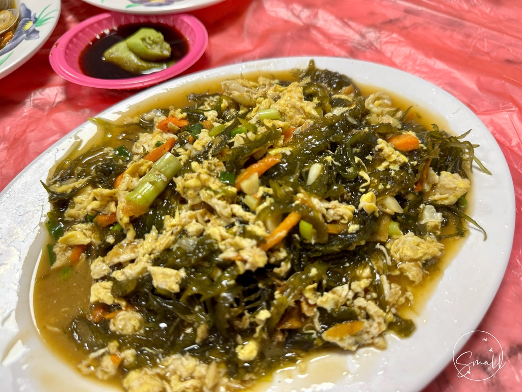 海菜炒蛋是一道簡單好吃的料理,口感滑順又帶有一點鹹味的海菜,跟嫩蛋、蔥段、紅蘿蔔絲相拌,味道豐富鹹香好入口